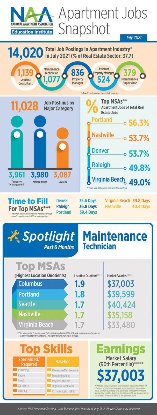 Record-breaking apartment rent growth and occupancy powered demand for multifamily talent in July. Nearly 38 percent of positions available in the real estate industry were in the apartment sector. Portland, Ore.; Nashville, Tenn.; Denver; Raleigh, N.C.; and Virginia Beach, Va.; led the nation with the highest concentration of job postings. This month’s edition of NAAEI’s Apartment Jobs Snapshot spotlights maintenance technician job openings.